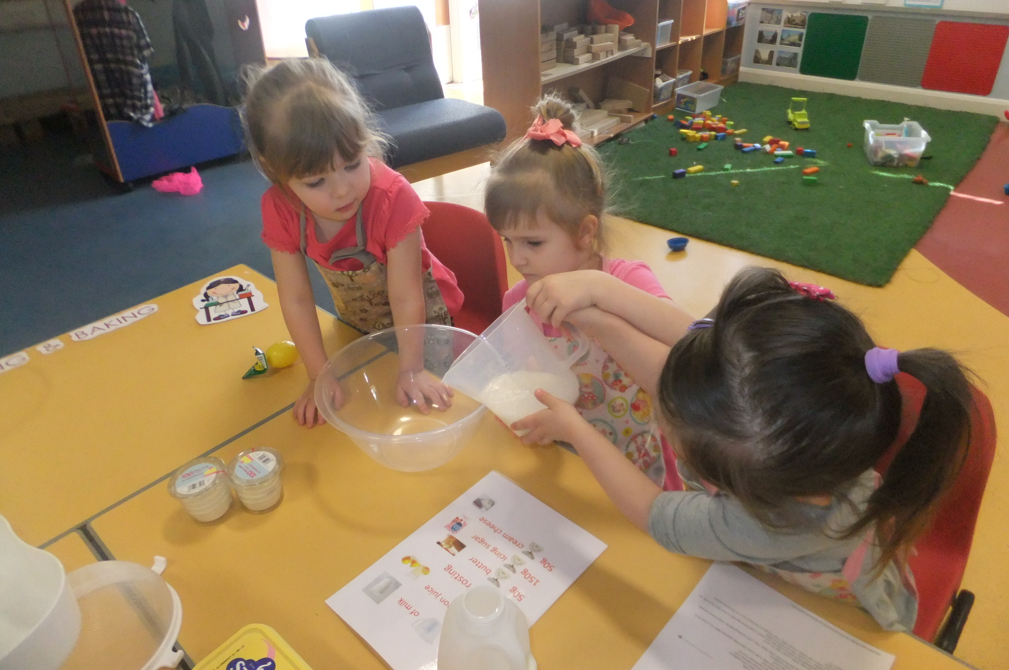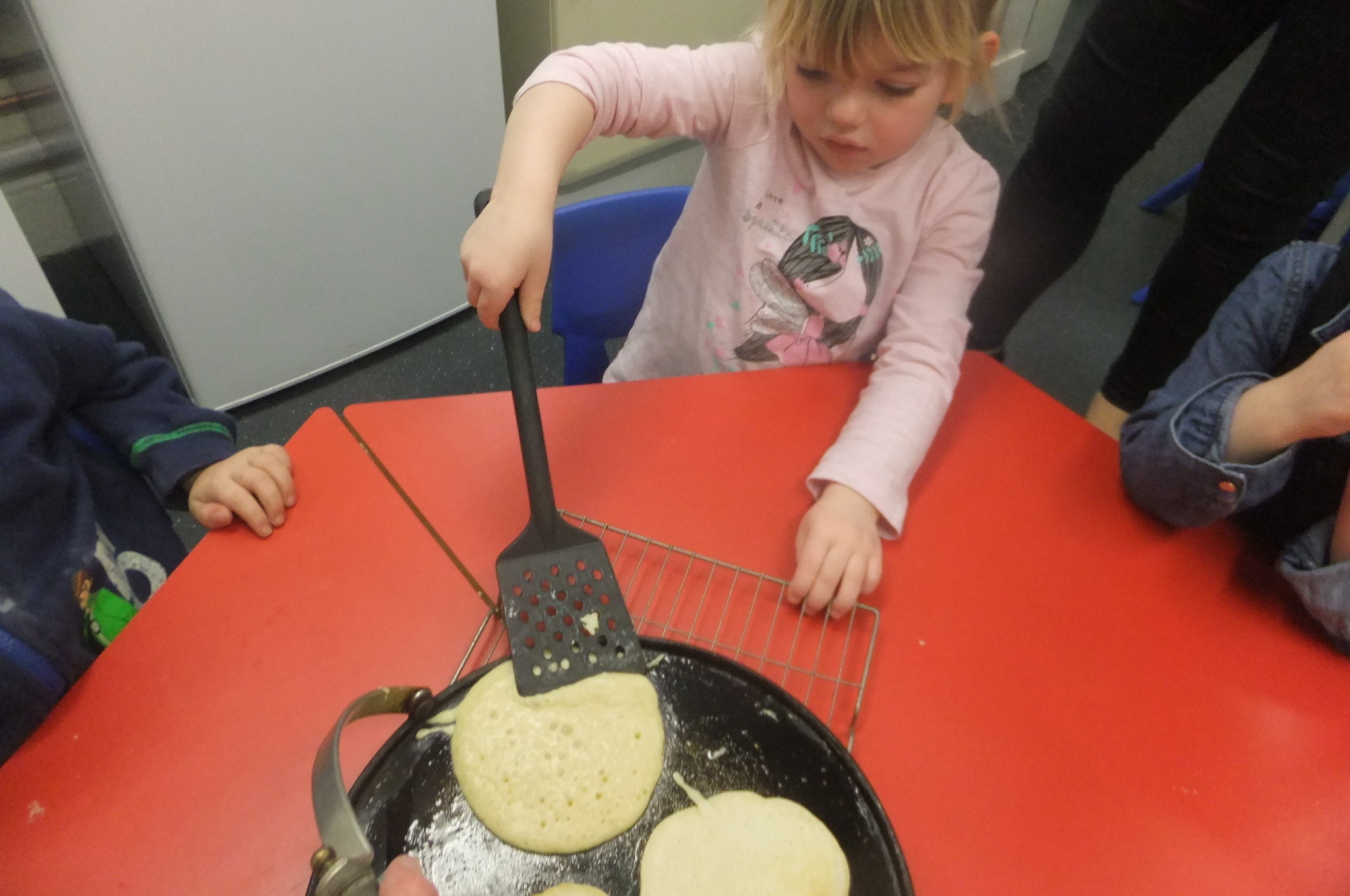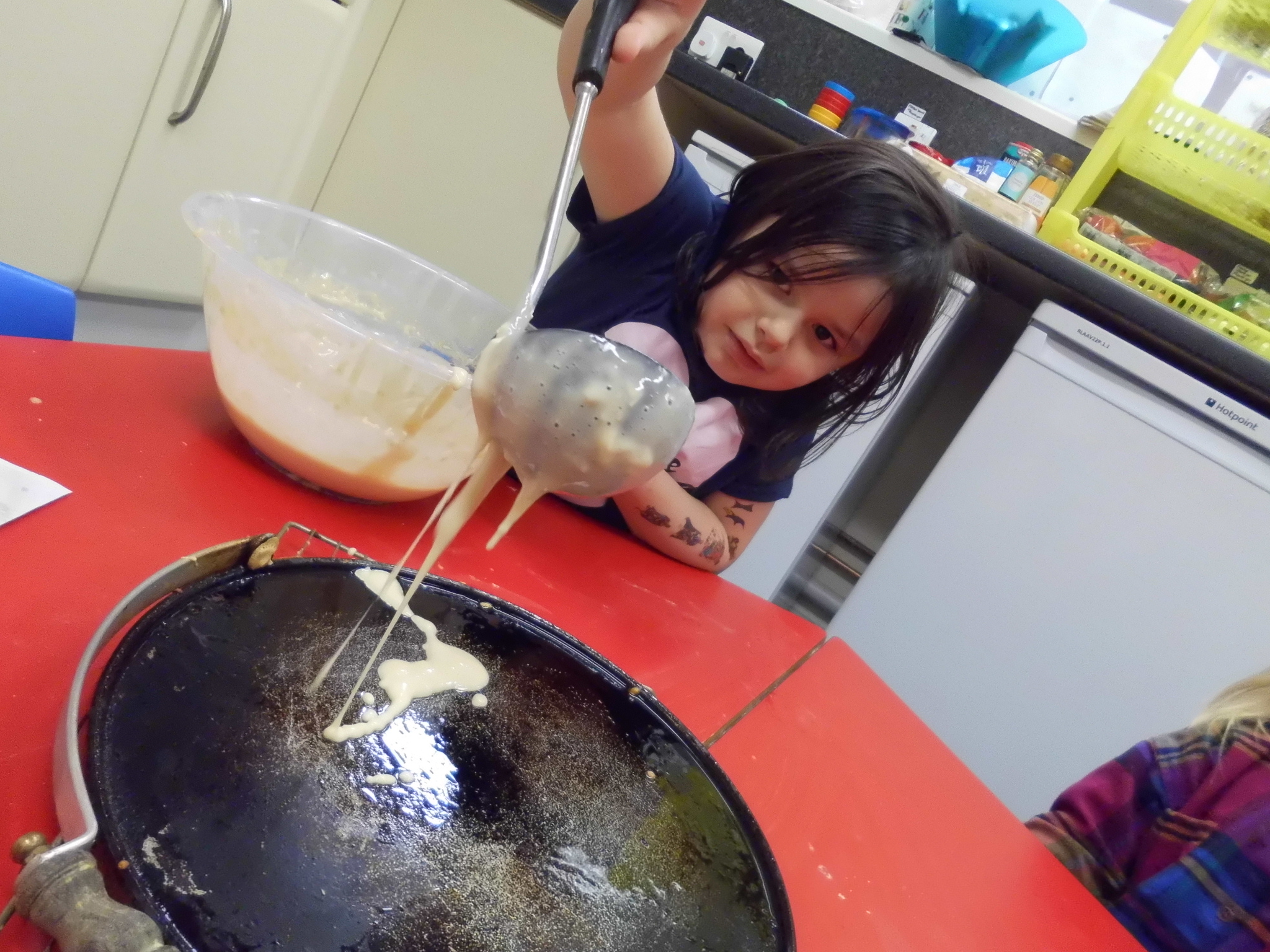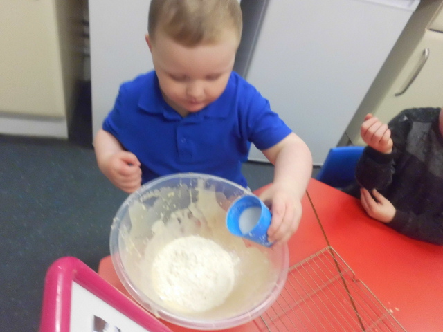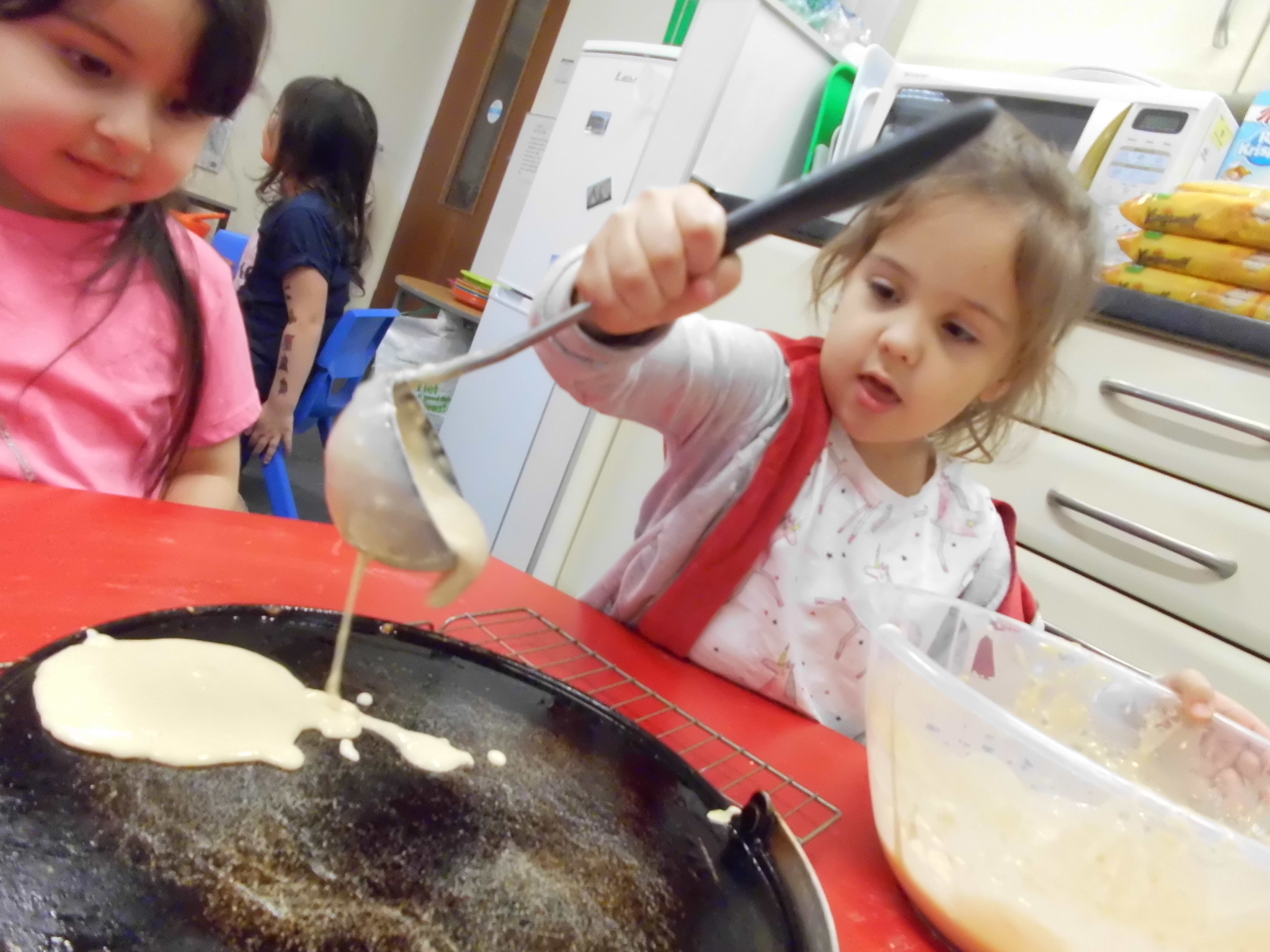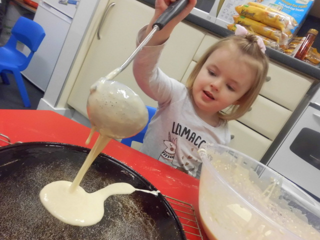 The children had lots of fun working together to measure out the ingredients to make the mixture. The children poured and flipped their pancake ensuring to be safe around the griddle before decorating and eating them for snack!